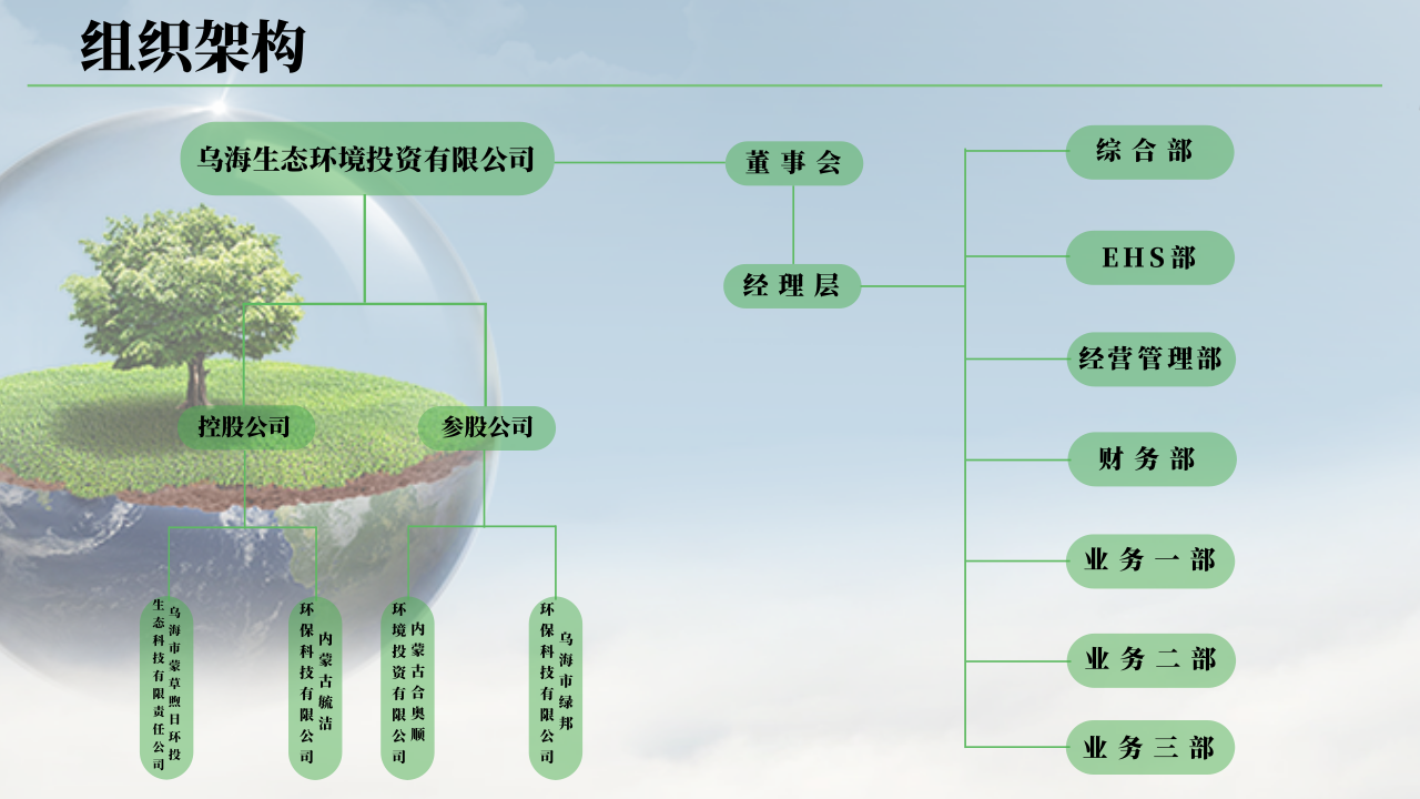 乌海生态环境投资有限公司是一家以矿山修复、固废危废资源化、新能源机械租赁为主业的国有企业,公司成立于2020年10月13日,注册资本6850万元,是内蒙古环保投资集团有限公司(正厅级)控股子公司,集团注册资本102.04亿,目前已完成战略重组,由华润环保科技有限公司控股,按照“立足内蒙古、辐射黄河流域、服务全中国”的发展思路,致力于黄河流域生态保护和高质量发展。旗下控股公司2家,参股公司2家,主营业务为一般工业固废(煤矸石、粉煤灰、电石渣)处置和焦化行业危险废物的资源化利用。